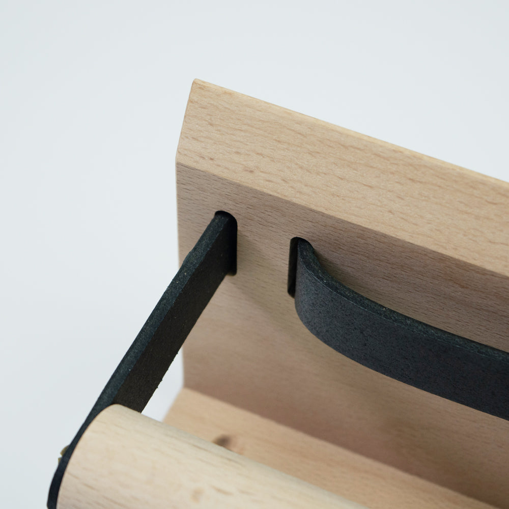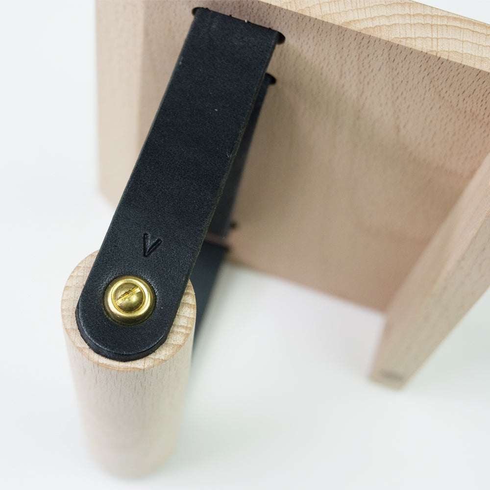 Materials: Solid beech wood, Nume leather, brass (hardware)