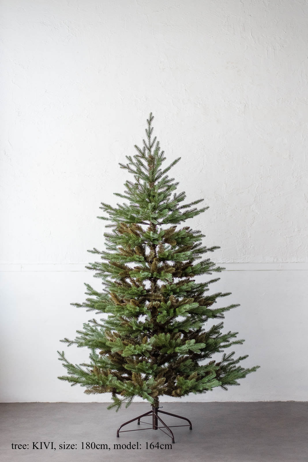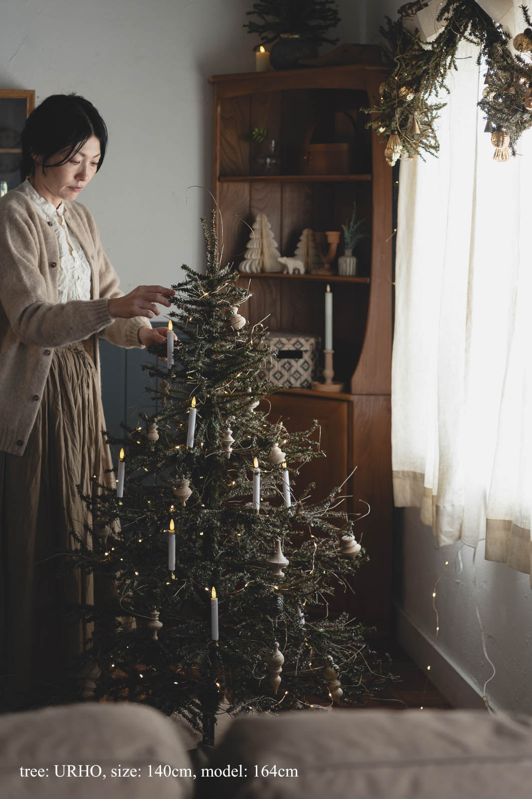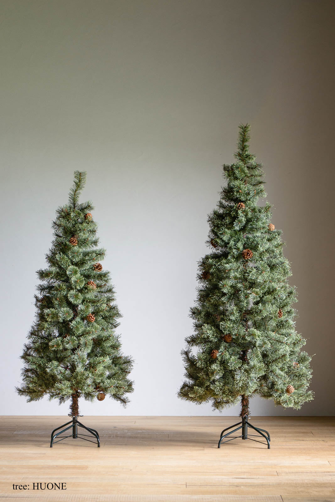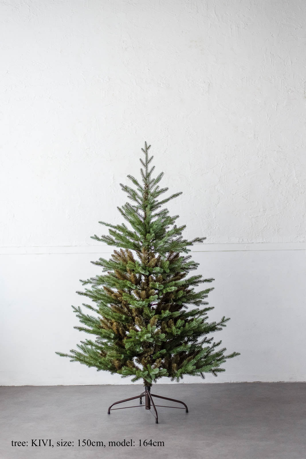 - シャープなシルエットと程よい間隔の枝が特徴。空間に余白を生み、オーナメントのきらめきやゆらぎを引き立てます。濃淡のある深緑が美しく、ミニマルで都会的な空間にも馴染む一本です。