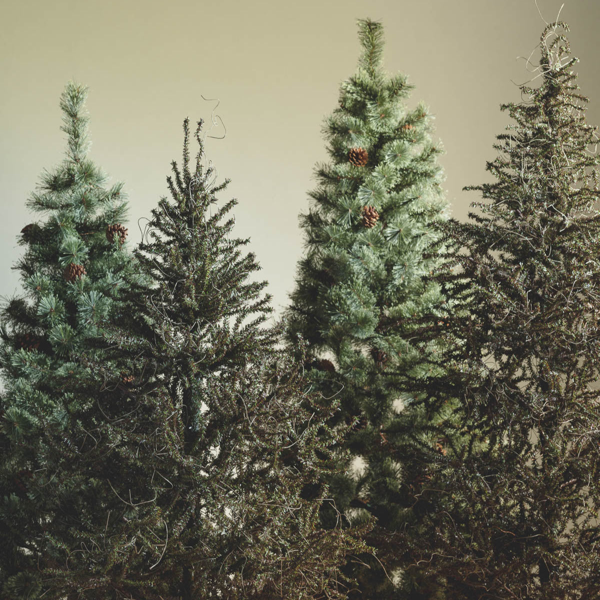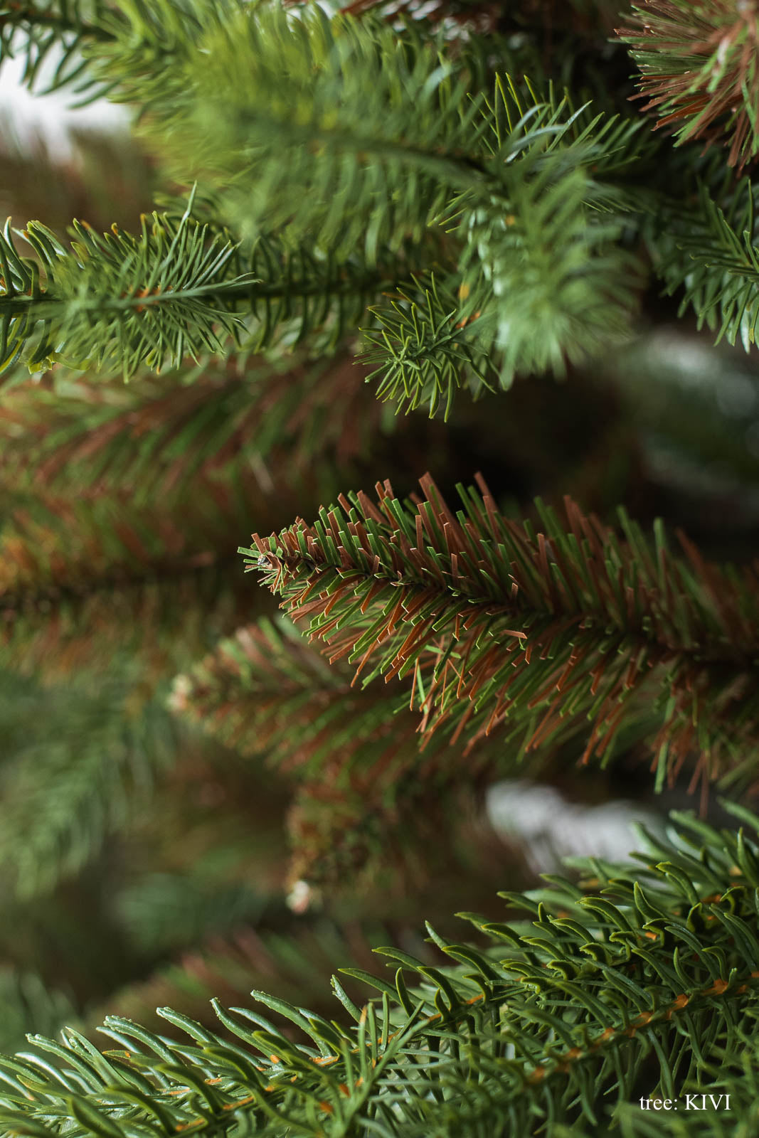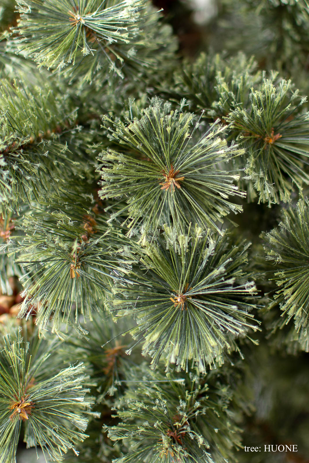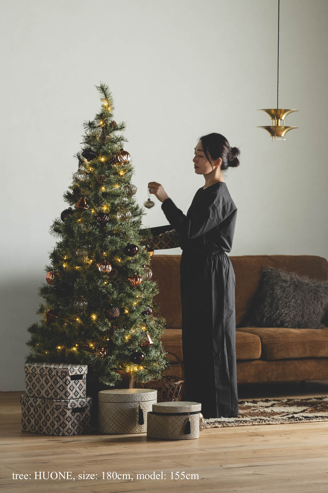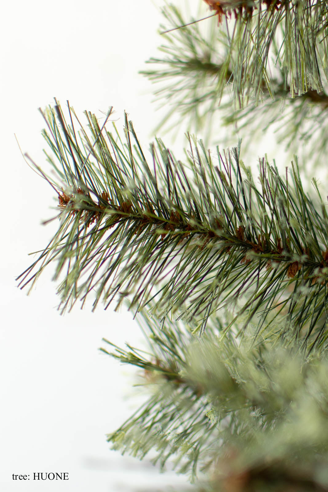 - シャープなシルエットと程よい間隔の枝が特徴。空間に余白を生み、オーナメントのきらめきやゆらぎを引き立てます。濃淡のある深緑が美しく、ミニマルで都会的な空間にも馴染む一本です。
