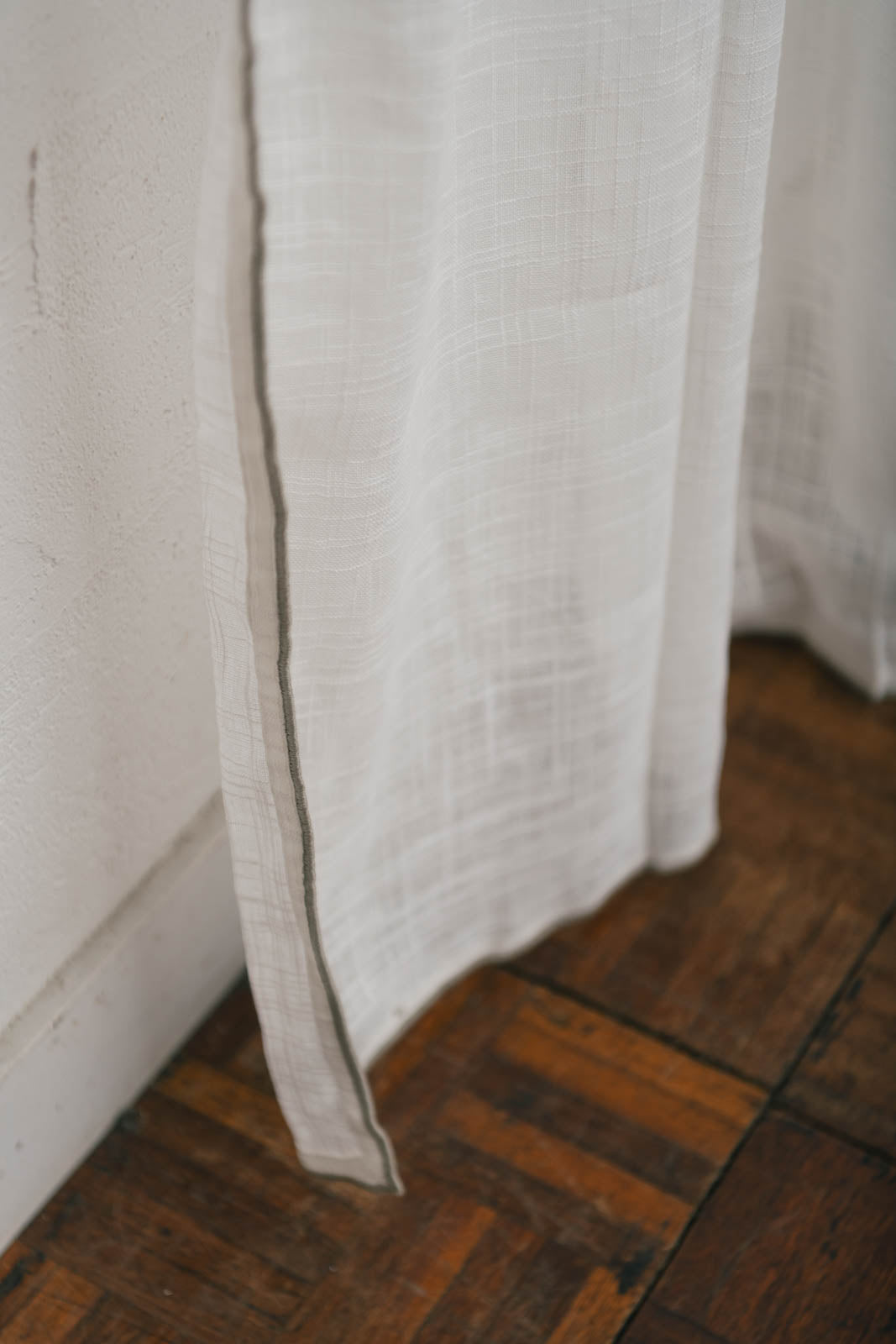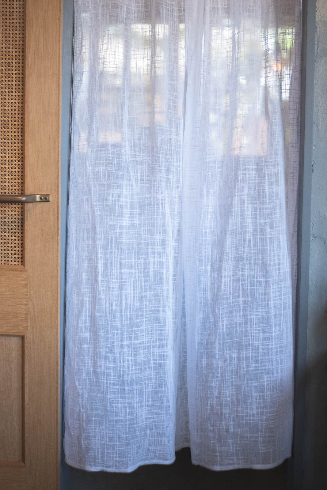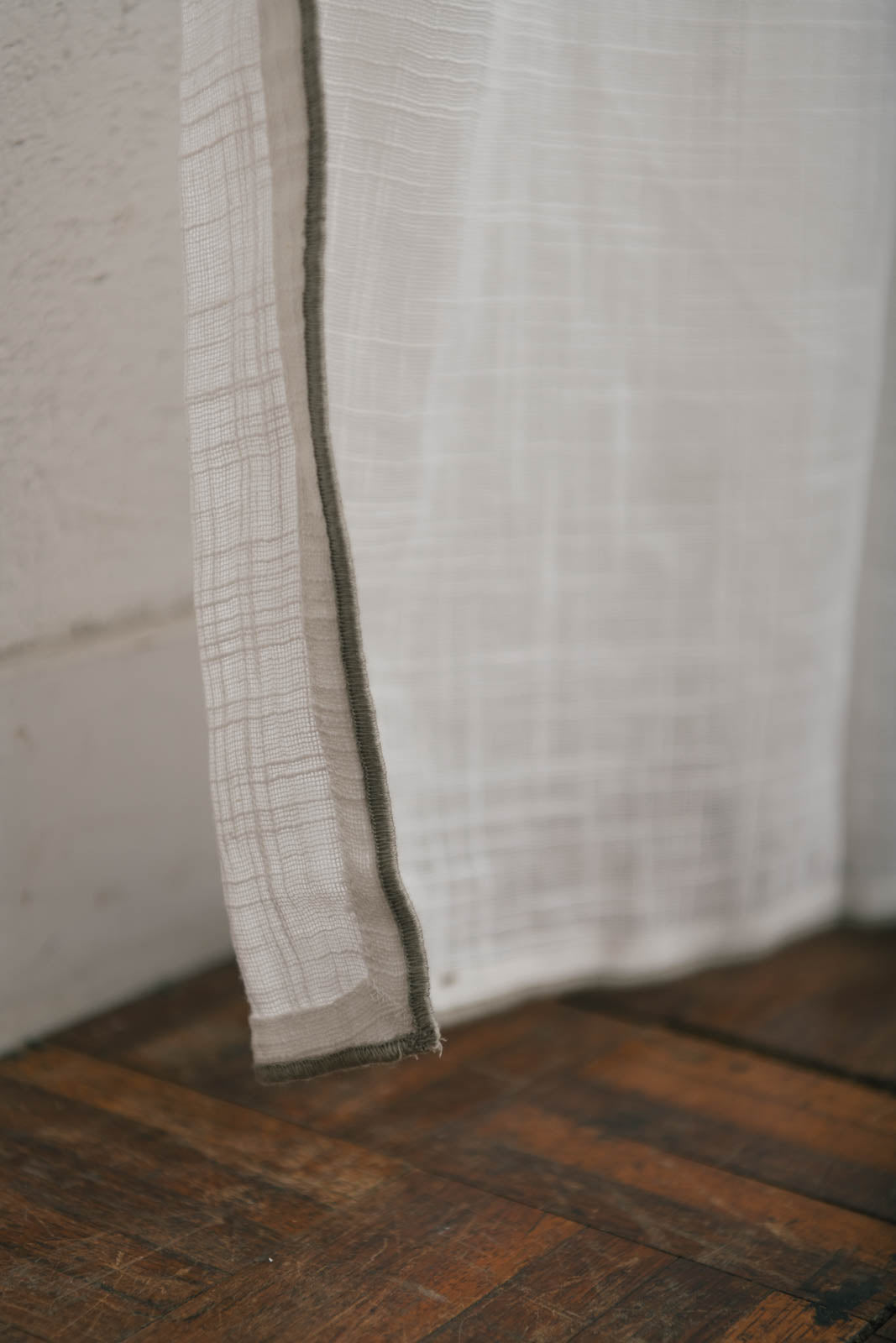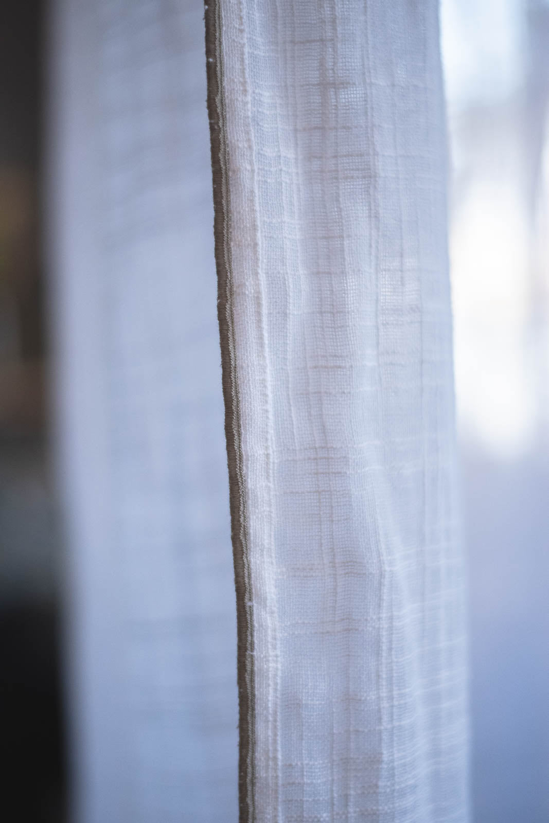 透けたときに浮かぶ織り模様は、スラブ生地ならではの味わい。細くなったり太くなったり——糸の自然なムラがやさしい表情を生み、お部屋にやわらかな空気感を添えてくれます。