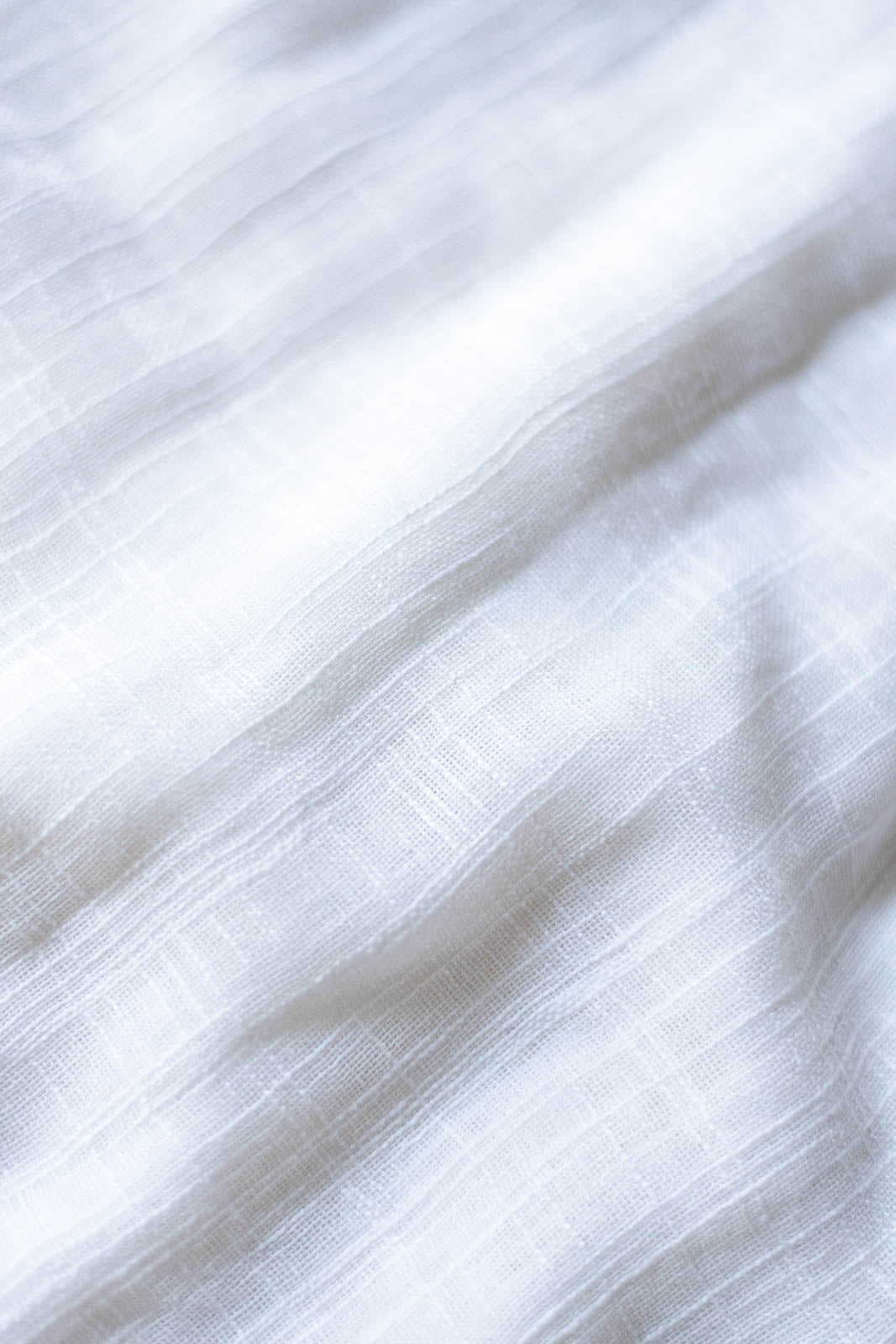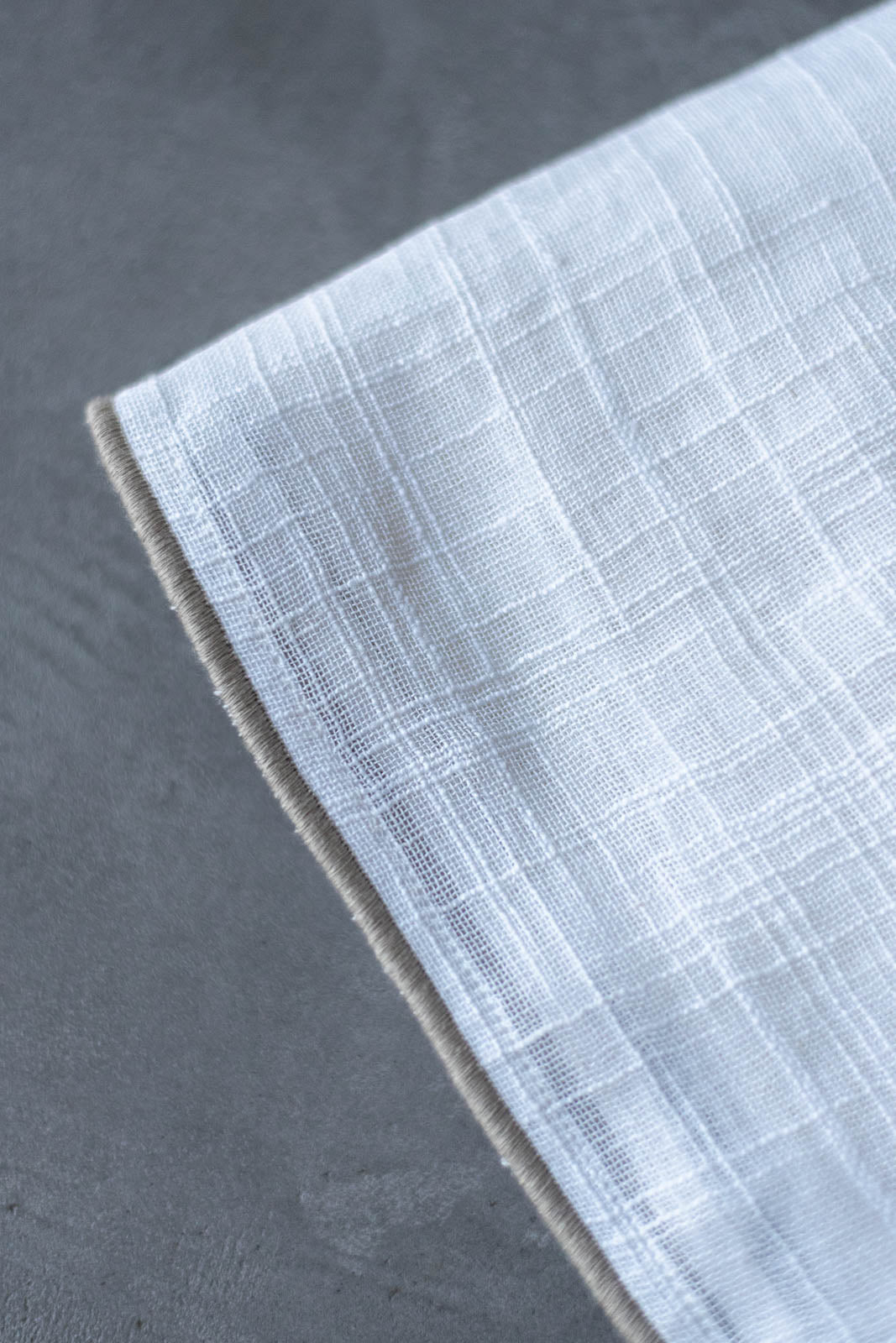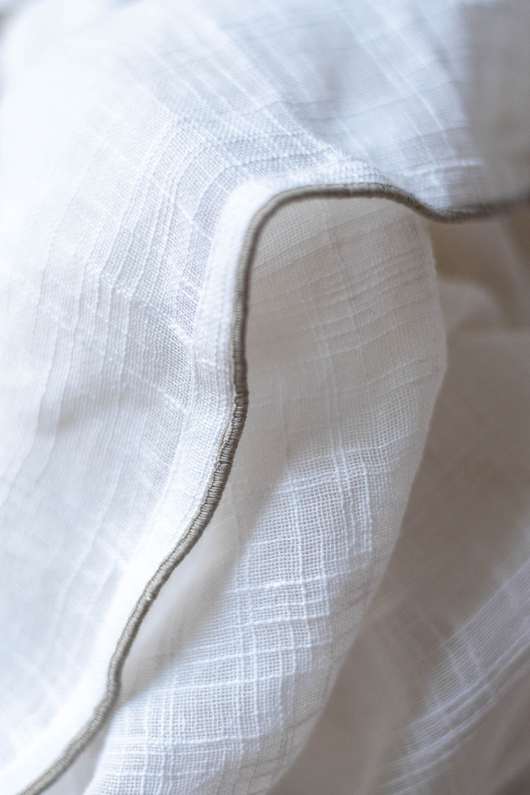 透けたときに浮かぶ織り模様は、スラブ生地ならではの味わい。細くなったり太くなったり——糸の自然なムラがやさしい表情を生み、お部屋にやわらかな空気感を添えてくれます。