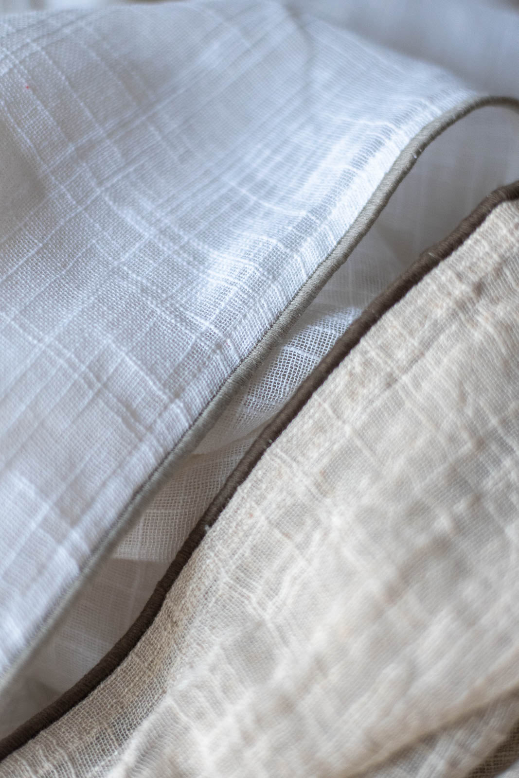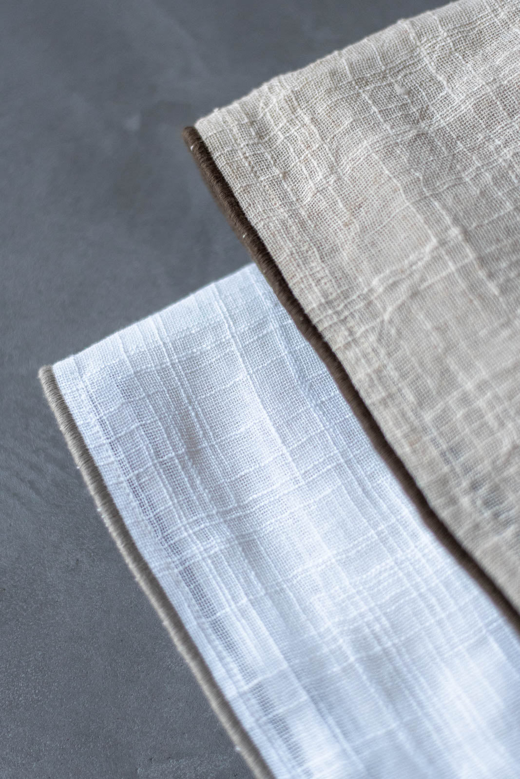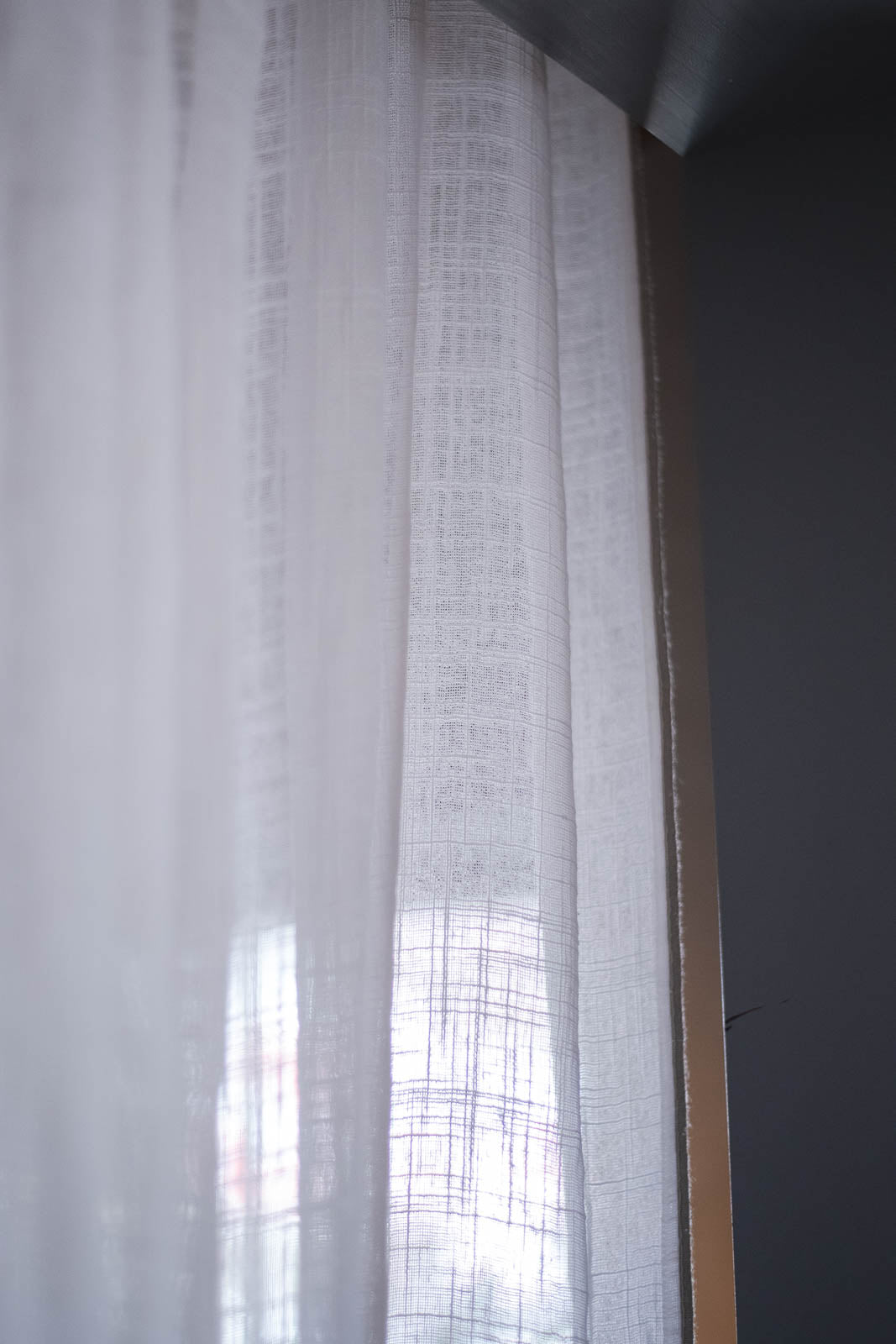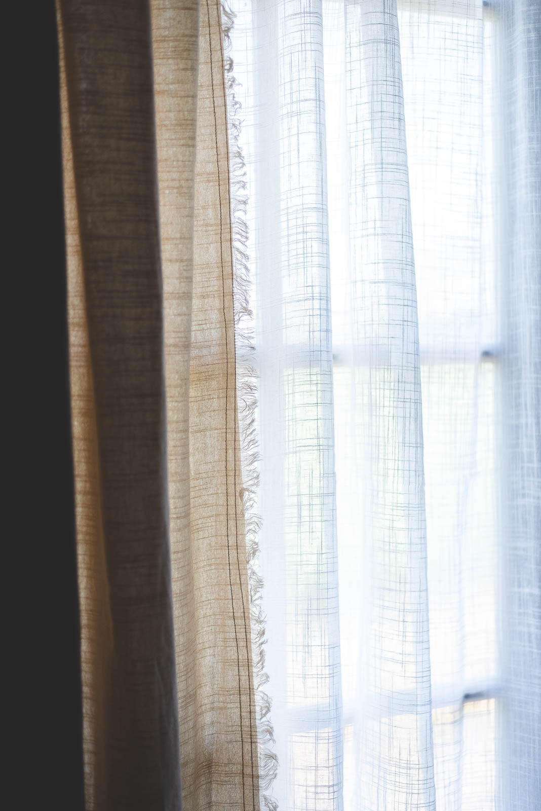 透けたときに浮かぶ織り模様は、スラブ生地ならではの味わい。細くなったり太くなったり——糸の自然なムラがやさしい表情を生み、お部屋にやわらかな空気感を添えてくれます。