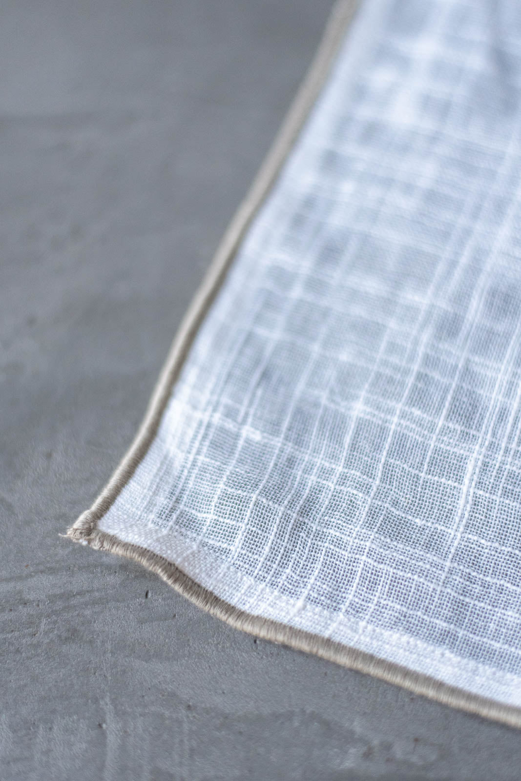 素朴な風合いのホワイトスラブ生地に、明るいグレーのステッチを添えた一枚です。
