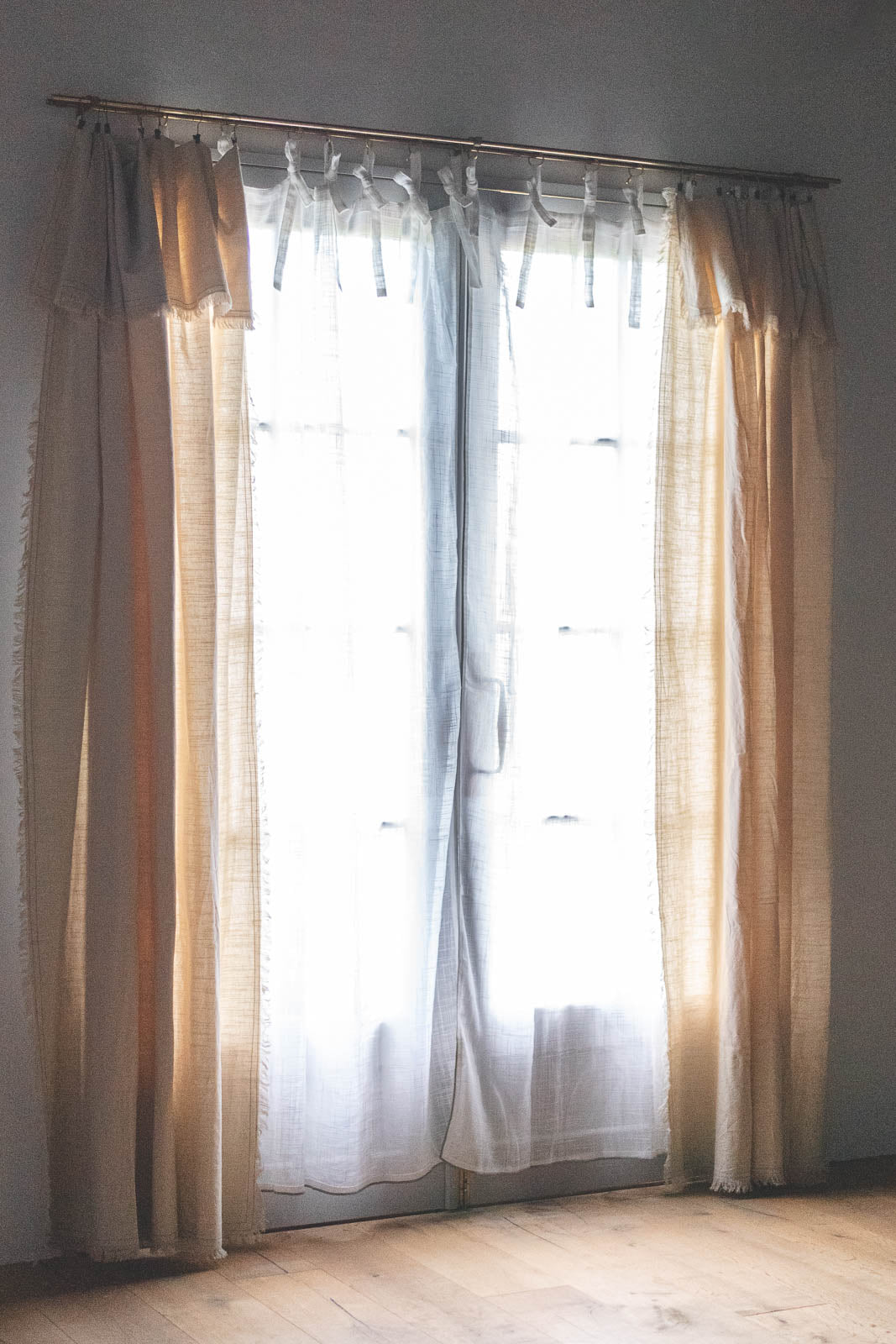 マルチクロスをゆるやかに吊るして、カーテンのようにアレンジしても。素材感をそろえることで、空間に統一感が生まれます。