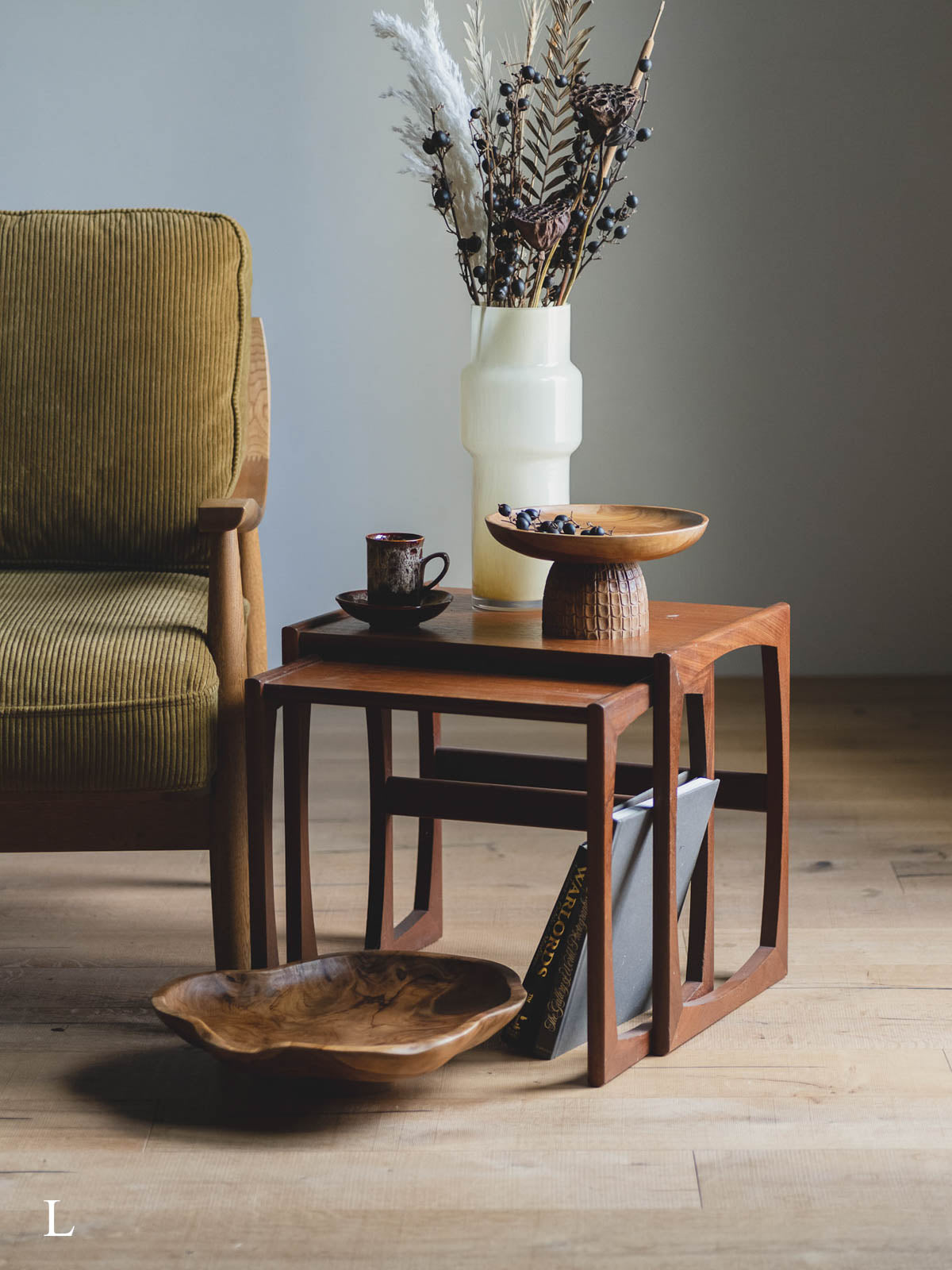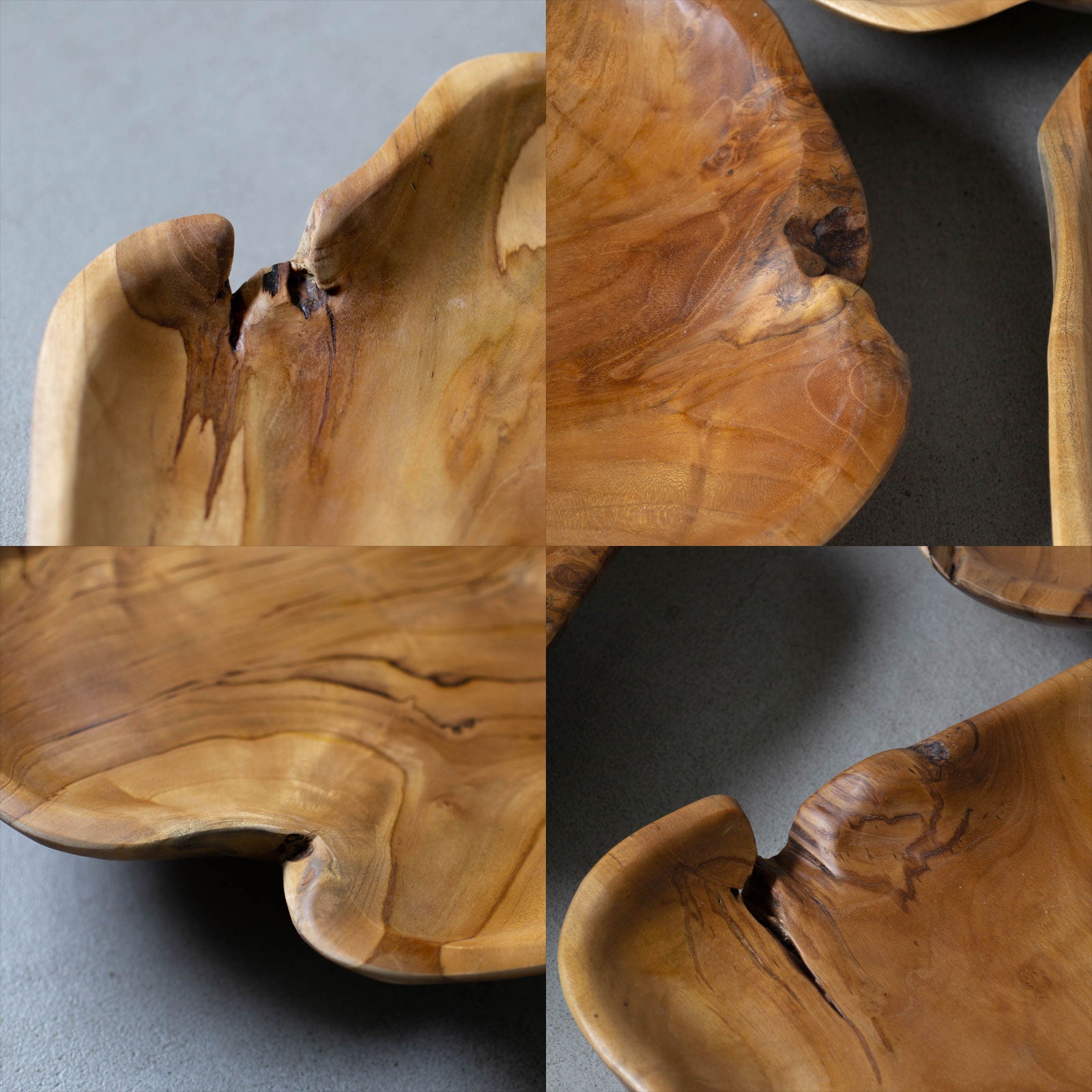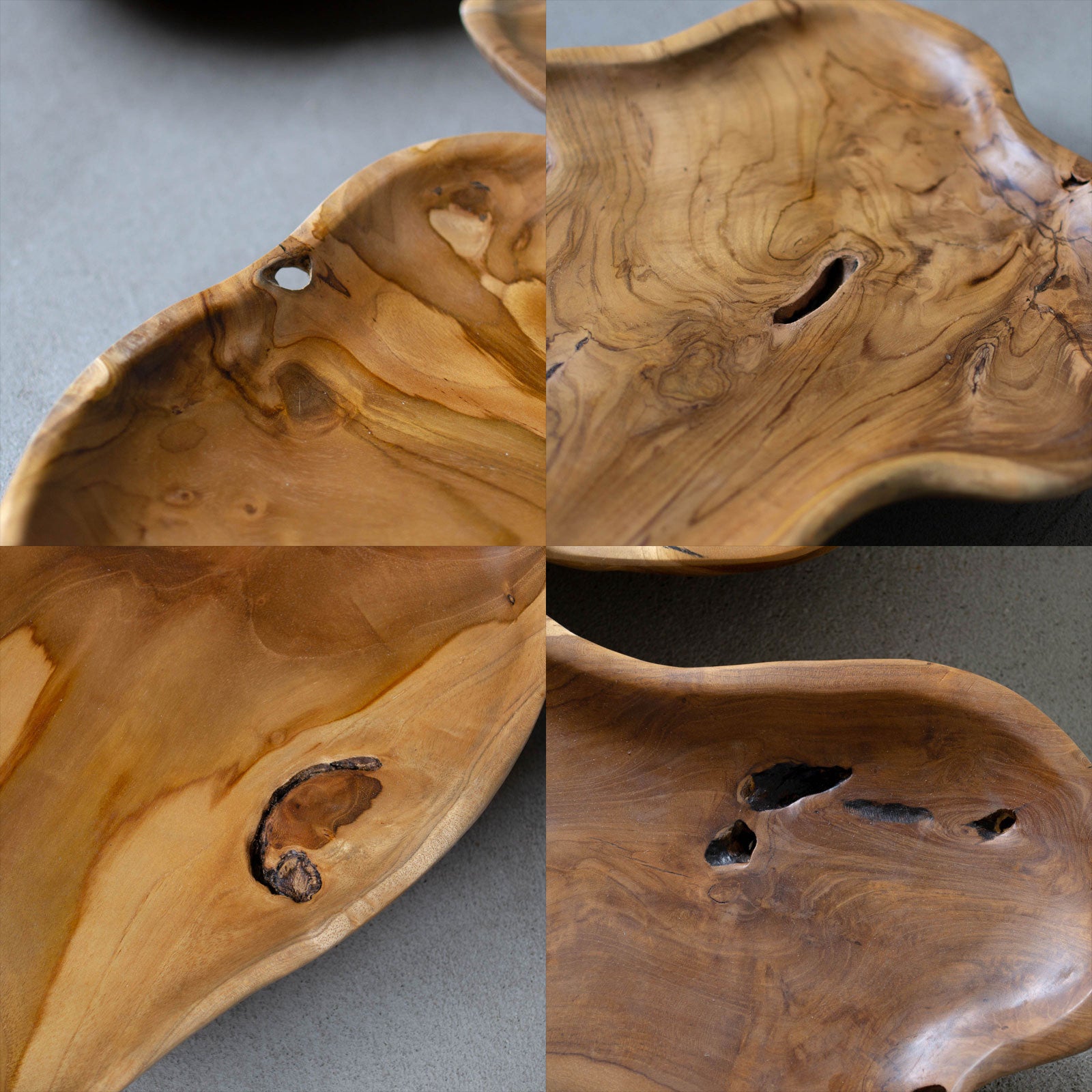 横から見た時のシルエットの美しさにもこだわった、ワイルドな魅力を持つ脚付きボウル。無垢チーク材の節や木目等の個性をあえて残し制作しました。少し大振りで目を引く存在感があります。可愛いだけではない落ち着いた風合いはヴィンテージにもよく似合い、大人っぽい上品な設えにぴったりです。