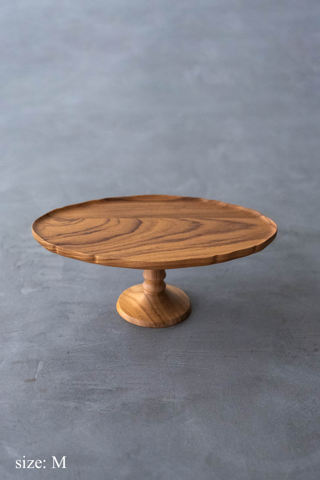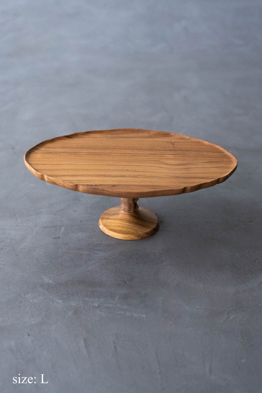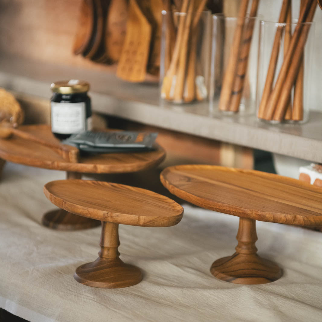 上質なチーク材の美しい木目と縁のゆるやかなカーブデザインが映える、クラシカルな印象のオーバル型のケーキスタンド。