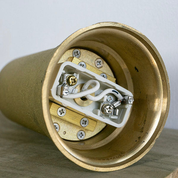 LED光源を真鍮鋳肌のボディに反射させて光らせている間接照明です。ランプ下部のつまみが調光ダイヤルになっています。