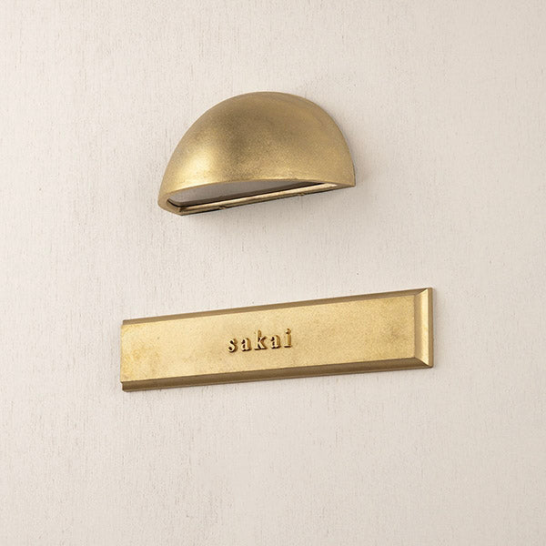 屋外に据えた真鍮は時間とともに酸化し、黄金色から深い琥珀色へとゆっくり熟成します。 この “経年変化の美しさ ”こそネームライトの醍醐味。日中は味わい深いマテリアルとして存在感を放ち、夜間は柔らかな光で表札を浮かび上がらせ、家の顔を静かに彩ります。