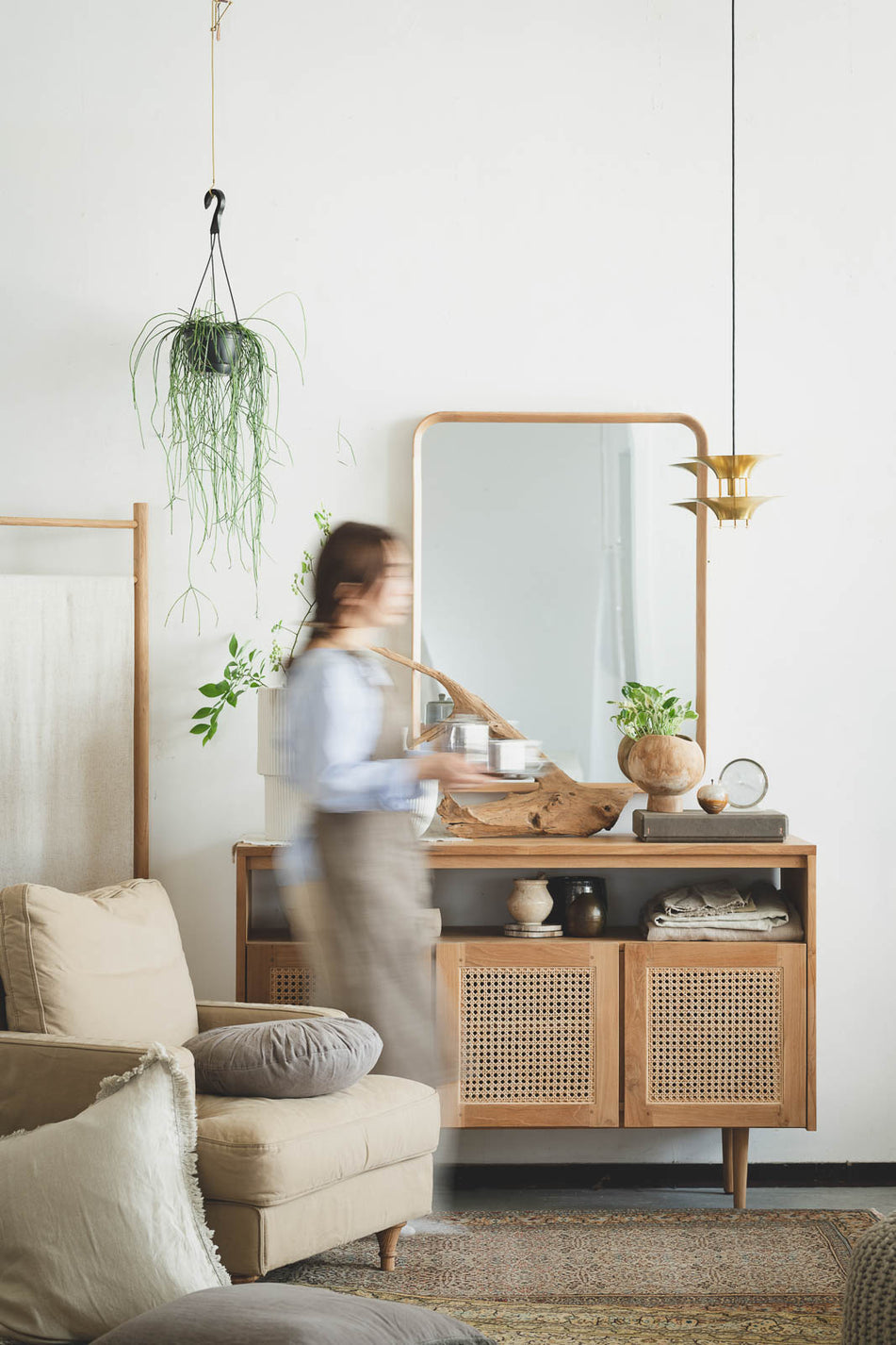 シンプルで美しい木目が魅力のオーク材を使用しています。無着色のため、使い始めはナチュラルで明るい色合い。使い込むほどに、色味が徐々に深まり、味わいのある風合いへと育っていきます。木のぬくもりある質感とやわらかな曲線が、上質で落ち着いた雰囲気を生み出し、お部屋にさりげないナチュラルな心地よさを添えてくれます。