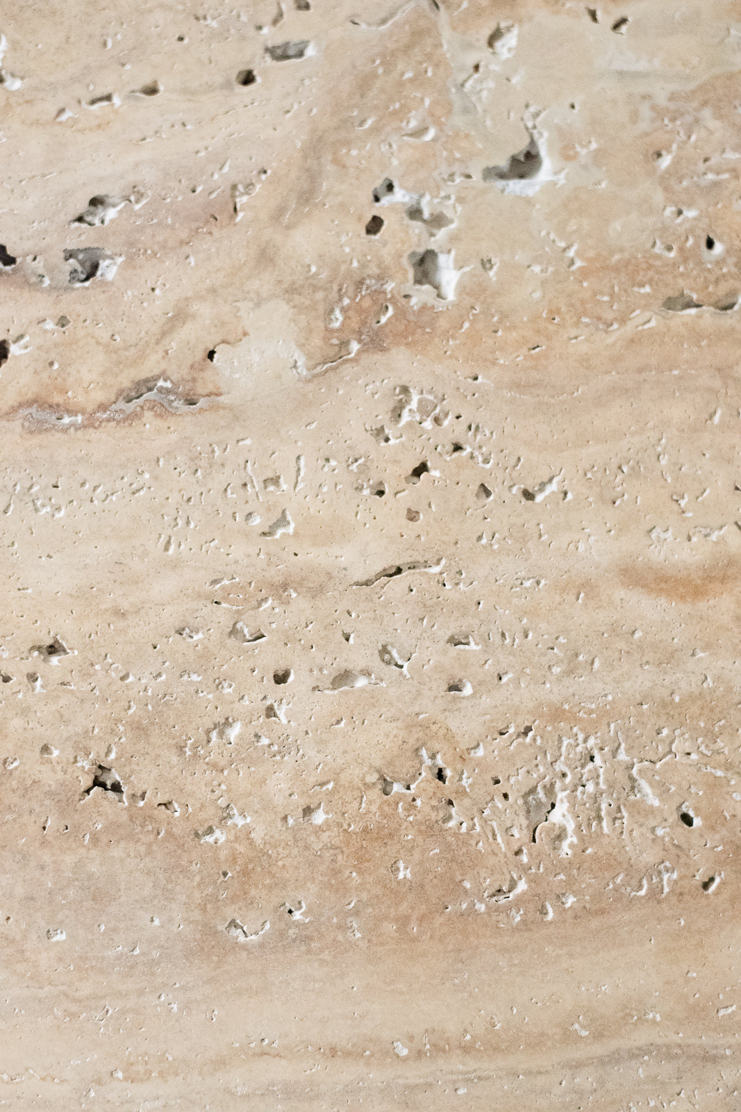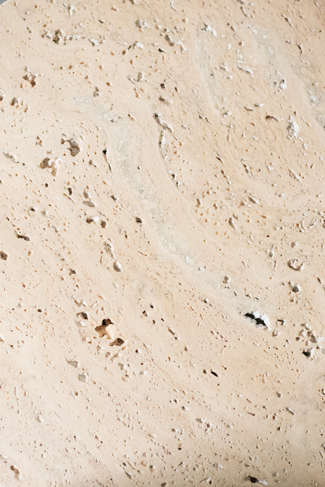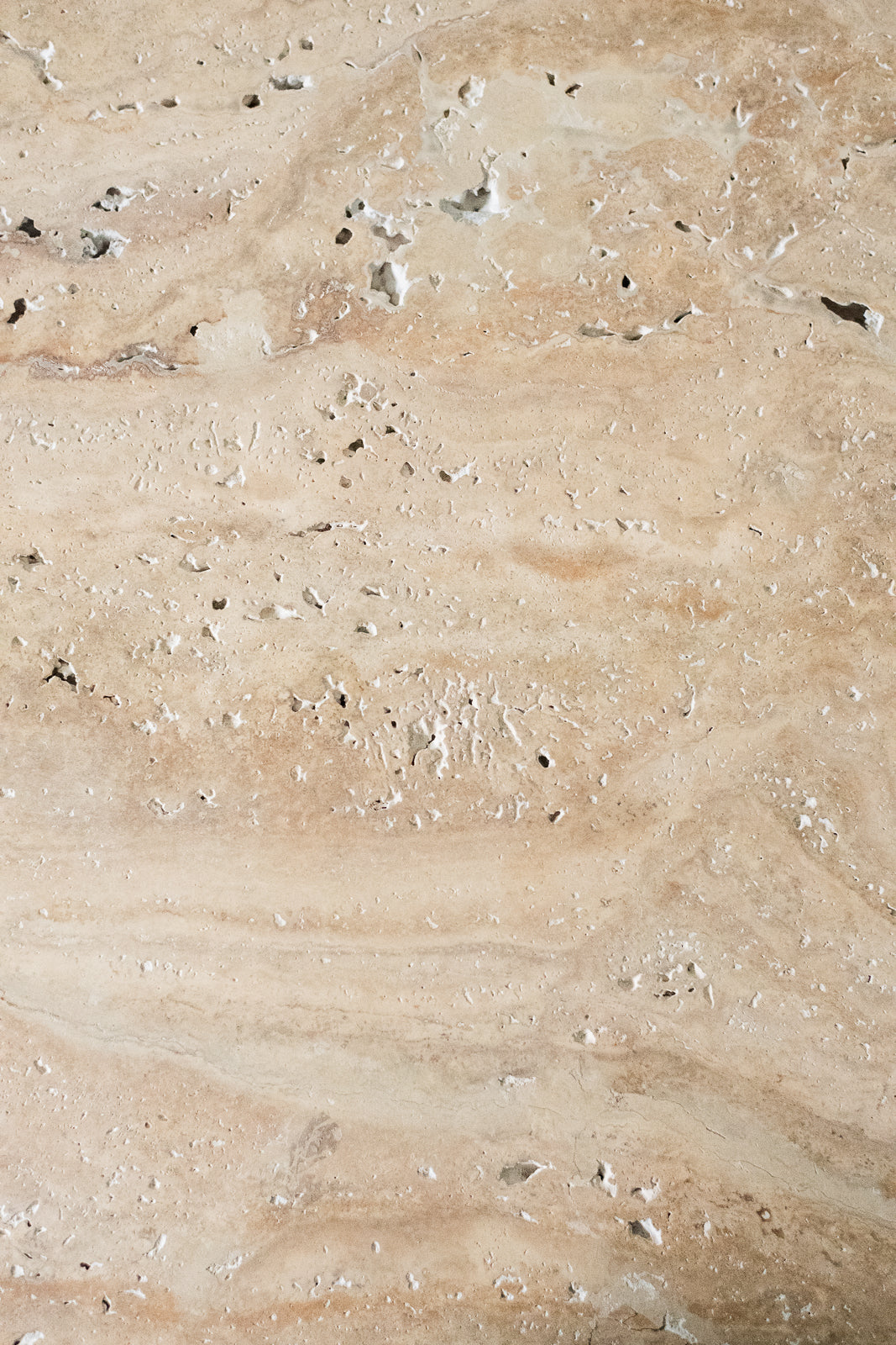 トラバーチンは、長い時間をかけて形成された石灰岩。地層のような縞模様や気泡の跡が、やわらかな表情を生み出します。