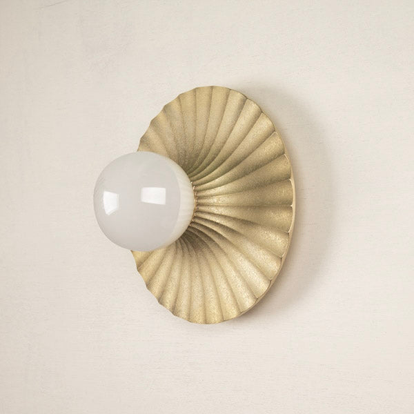 インテリアでは、ソファサイドに淡い光を添えてリビング全体を上質な寛ぎ空間へ昇華させたり、廊下やベッドサイドでナイトライトとして“ 点の光” を加えたい場面で重宝します。放射状に広がる真鍮反射板〈フレア・ウォール仕様〉は光を印象的に拡散し、壁面に華やかな陰影を描き出して空間をドラマティックに彩ります。