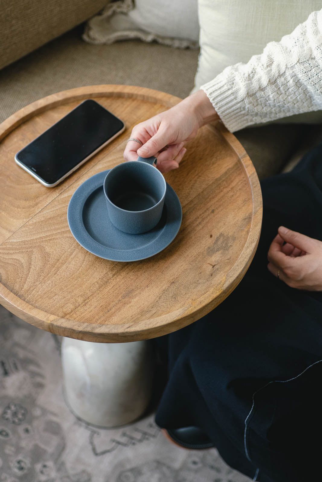 天板には、オイル仕上げを施したナチュラルカラーのマンゴーウッドを使用。縁がそっと立ち上がる天板と、コロンと丸みを帯びたベースの佇まいが、空間に穏やかな雰囲気をそっと漂わせます。