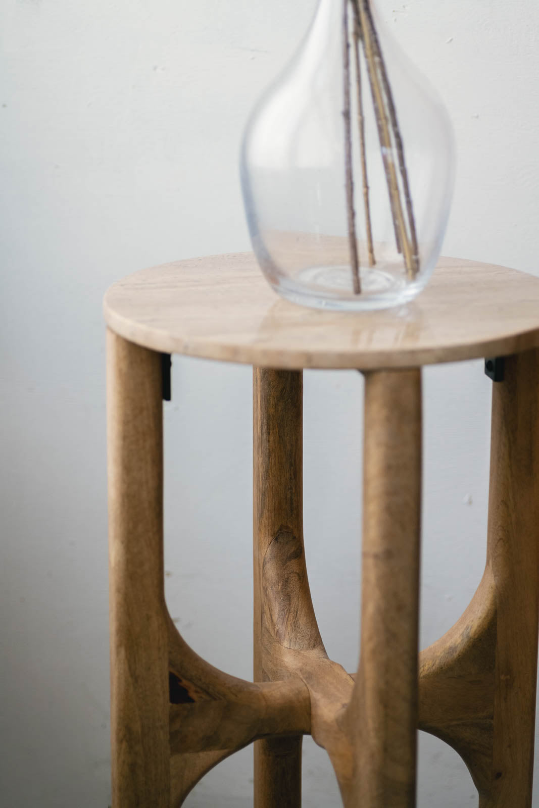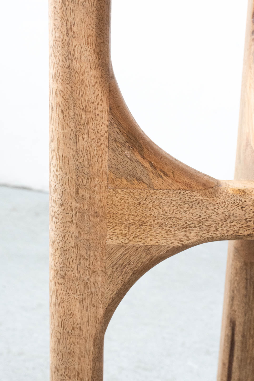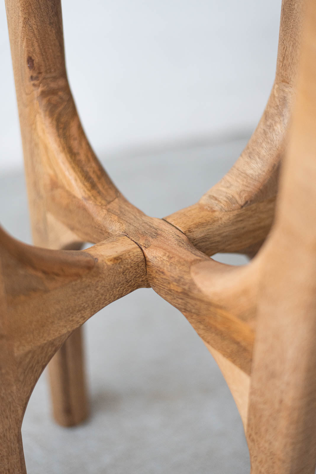 ベースには、オイル仕上げを施したナチュラルカラーのマンゴーウッドを使用。交差するように組まれた脚部(クロスベース)が、しなやかな強度とバランスの美しさを生み出します。直線と曲線が交わる構築的なフォルムが、素材の個性を際立たせ、どの角度から見ても美しい佇まいに。