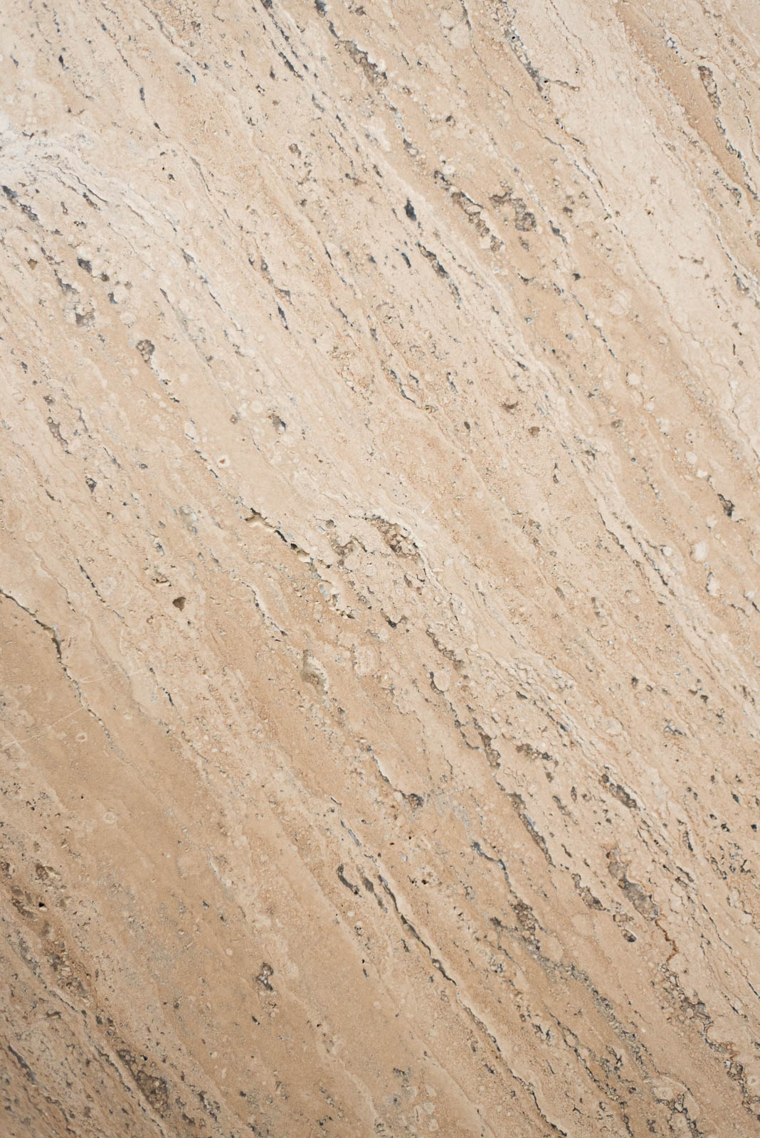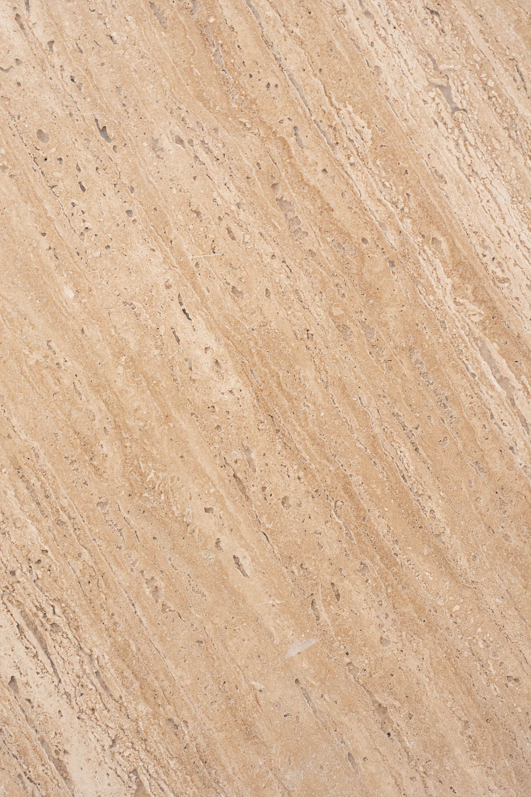 天板には、時間の層を閉じ込めたような模様が魅力のベージュトラバーチンを採用。淡くやさしい色合いと、天然石ならではの繊細な質感が調和し、光の加減で豊かな表情を見せます。ナチュラルな素材感が、木のベースと共に穏やかな存在感を演出します。