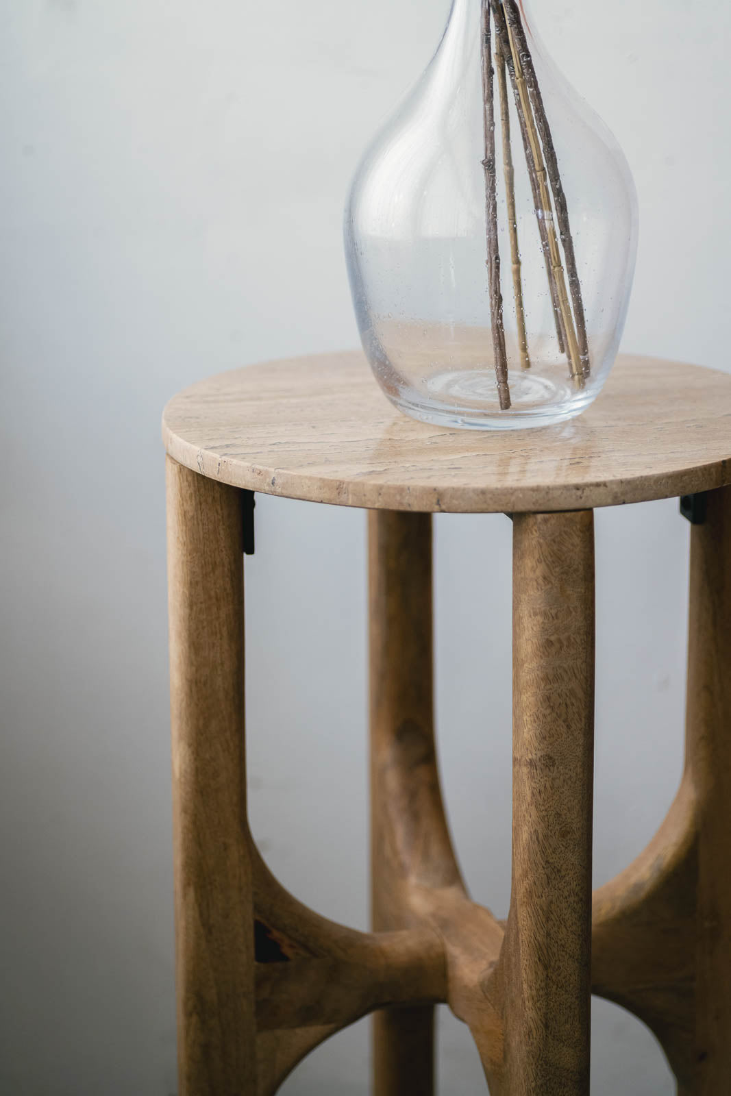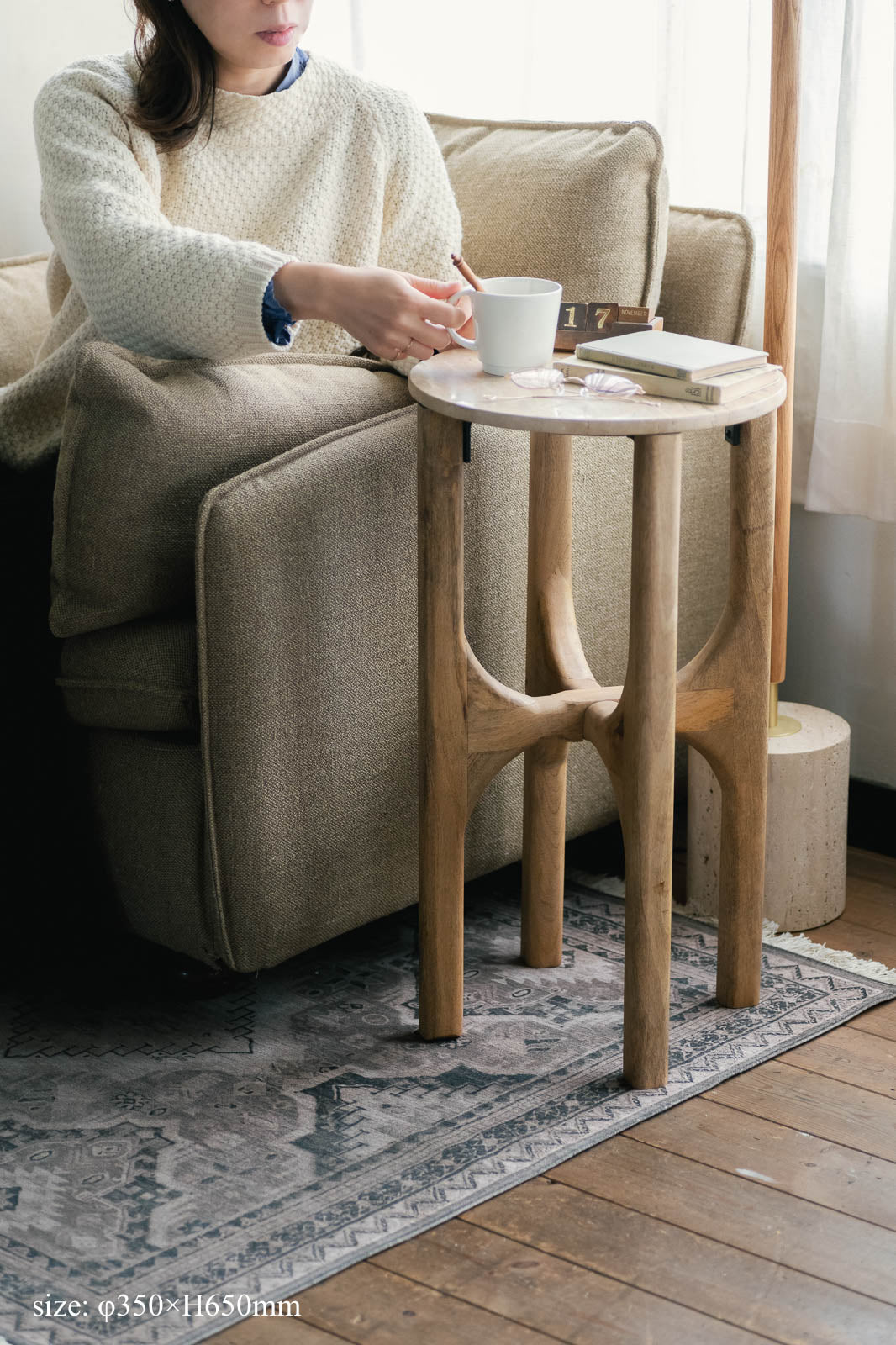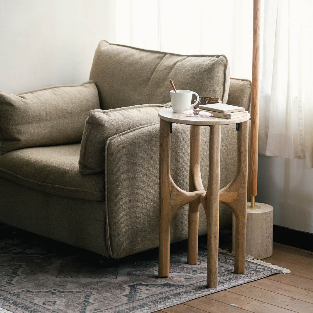 sed/met(セドメット)クロステーブルは、天然大理石とマンゴーウッドが織りなすコントラストを楽しむ、ラウンド型のアクセントテーブルです。小ぶりながらも確かな存在感を放ち、空間に上質なリズムと静けさをもたらします。