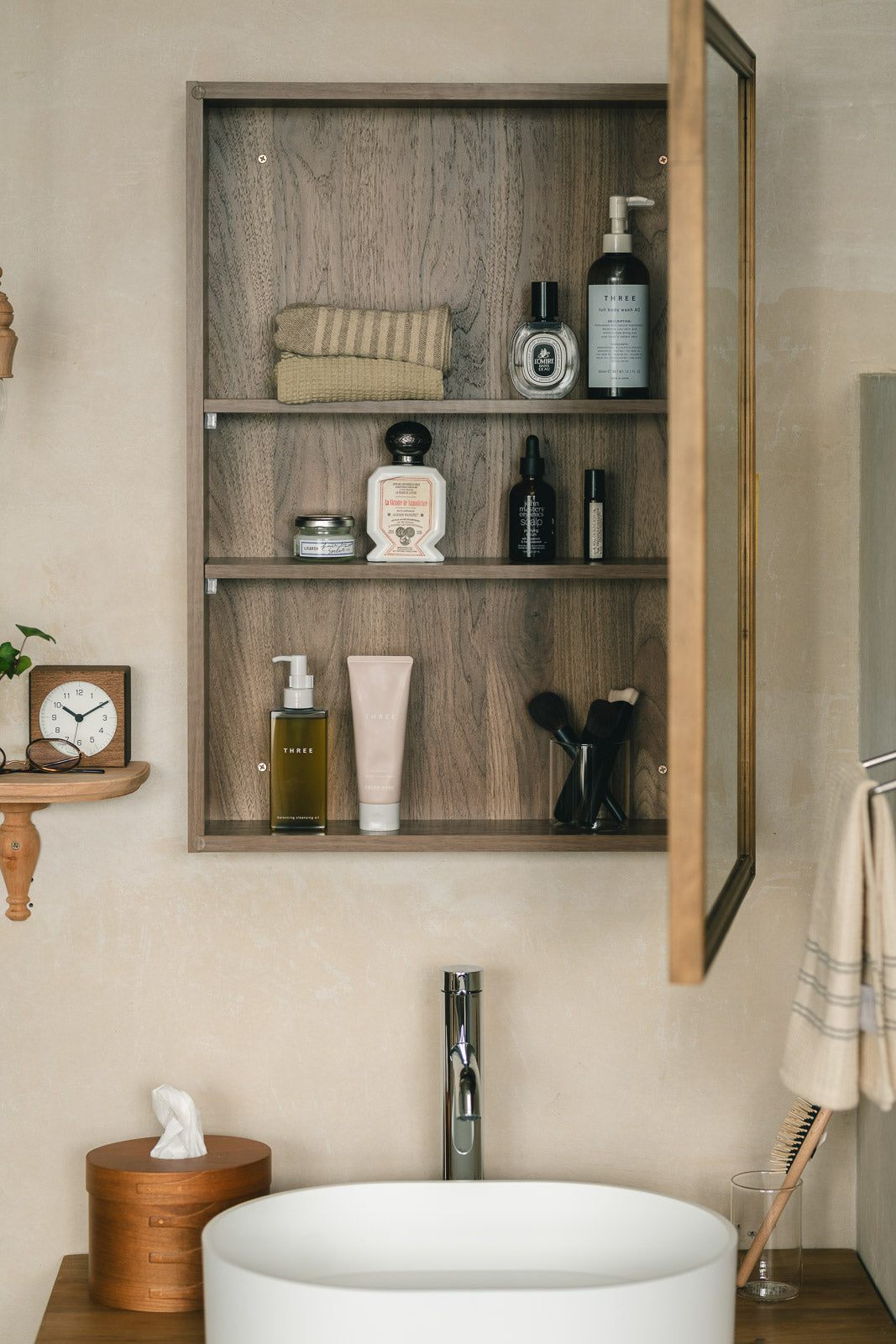 欧米ではメディシンキャビネットとして親しまれているミラー収納。洗面室での薬や衛生用品の保管はもちろん、化粧道具やスキンケア用品など、細々としたアイテムをすっきりまとめることができます。
