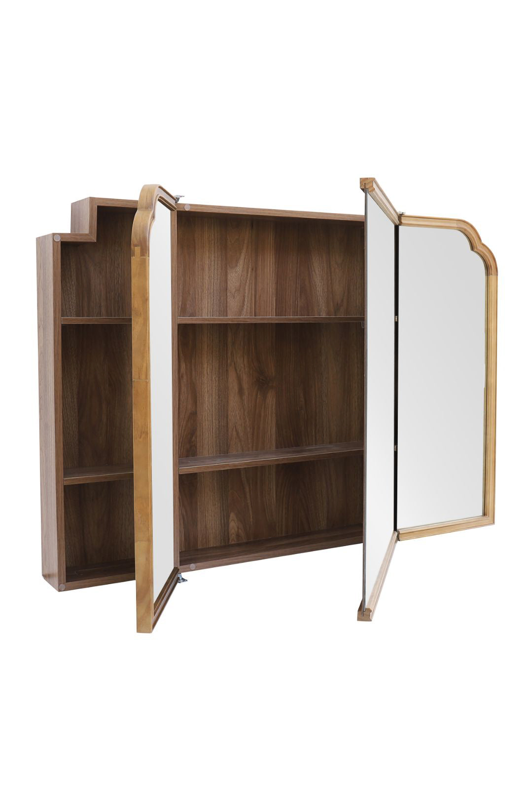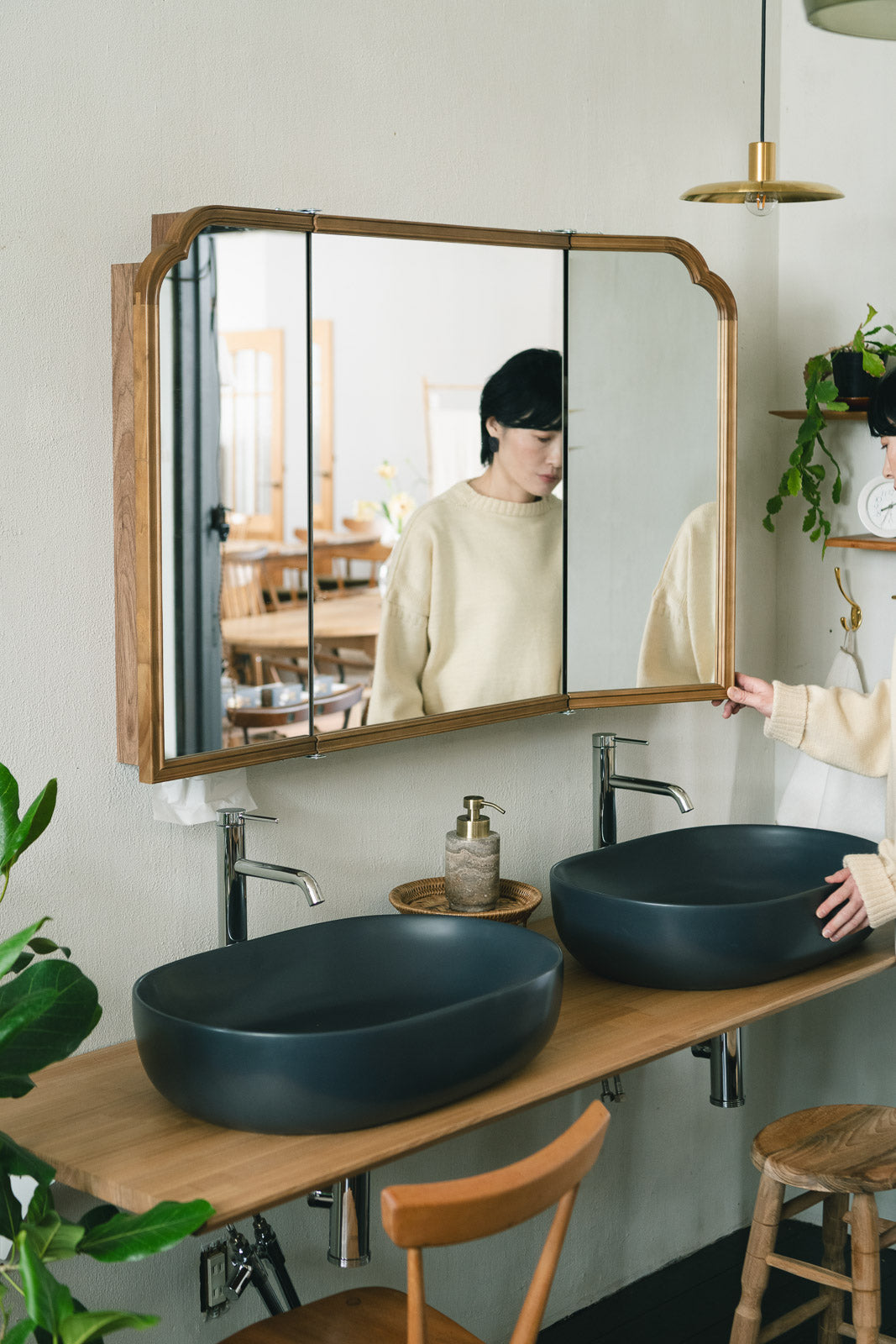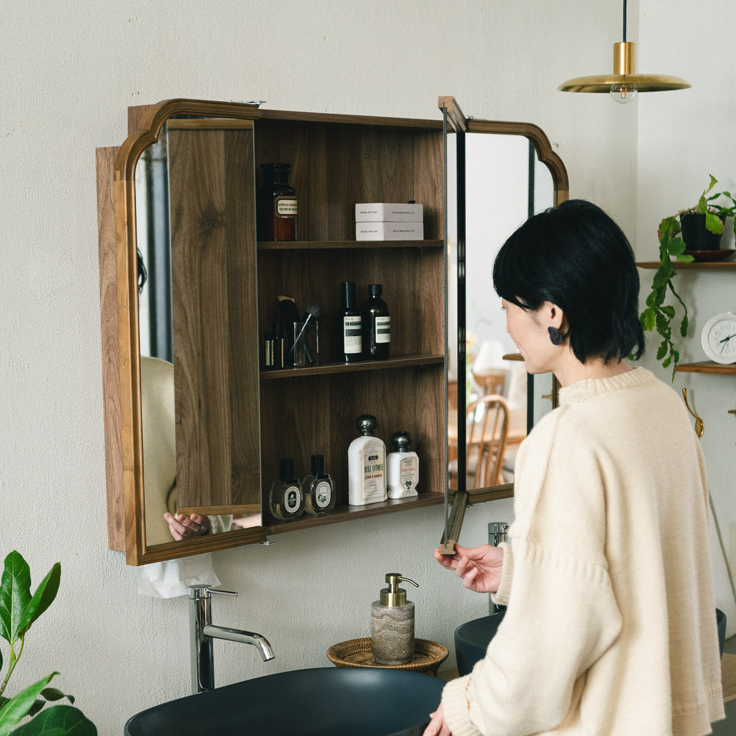 ワイドな3ドアでたっぷり収納、クラシカルな曲線を纏うキャビネットミラー
