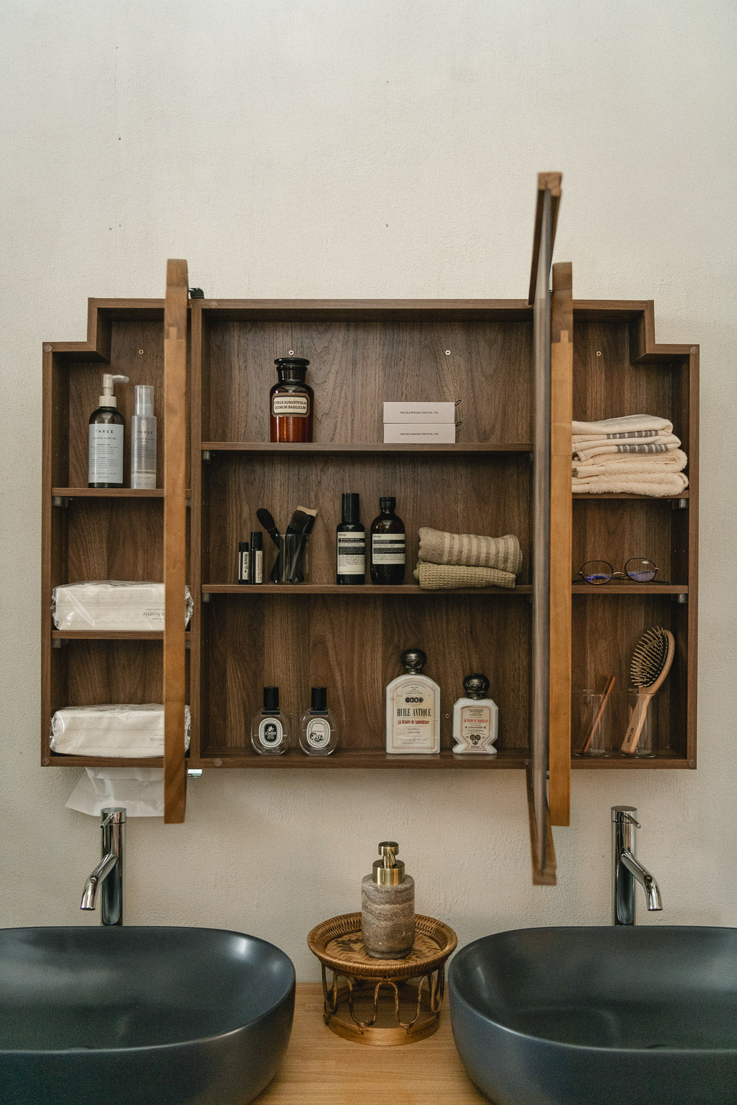 ダイナミックなサイズ感と、Wood archらしいリズムを感じるフレームデザイン。機能性と意匠性を兼ね備えた、洗面空間の”主役”となるキャビネットミラーです。