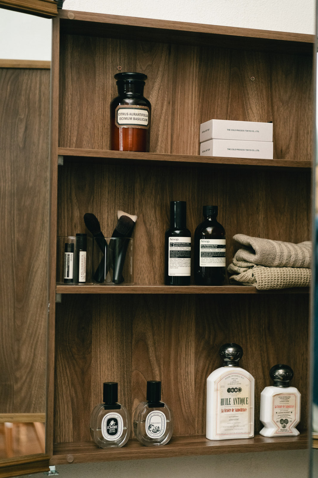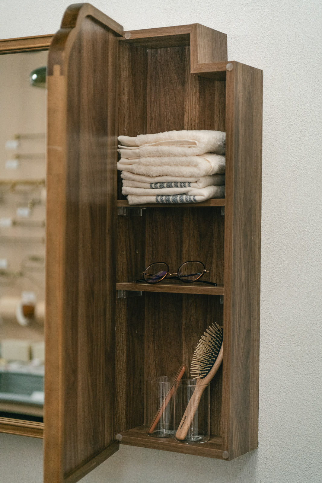 欧米ではメディシンキャビネットとして親しまれているミラー収納。洗面室での薬や衛生用品の保管はもちろん、化粧道具やスキンケア用品など、細々としたアイテムをすっきりまとめることができます。