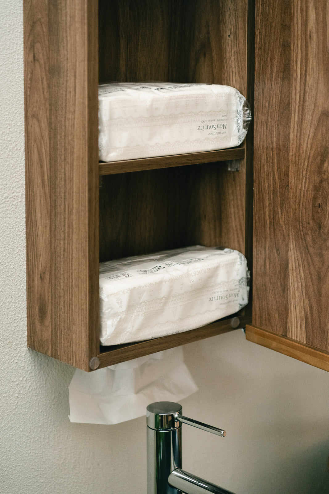 高さを活かした大容量収納も魅力のひとつ。棚板は可動式で、置くものに合わせて細かく調整が可能です。ボトル類や高さのあるアイテムもすっきりと収まり、収納の自由度を高めます。また、キャビネットの底面からティッシュを取り出せる仕様で、生活感を抑えながら使い勝手にも配慮しました。